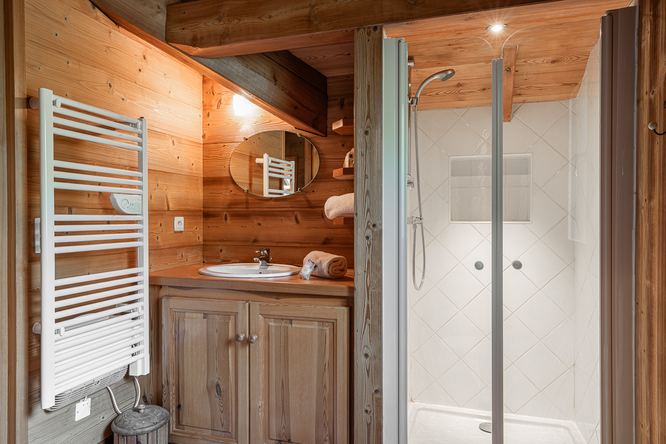 The night space includes two superb parental suites, each equipped with a freestanding bathtub, an Italian-style shower, a double washbasin and independent toilets, offering comfort and privacy. One of the suites benefits from an unobstructed view of the garden, while the other offers an exceptional panorama of the slopes.