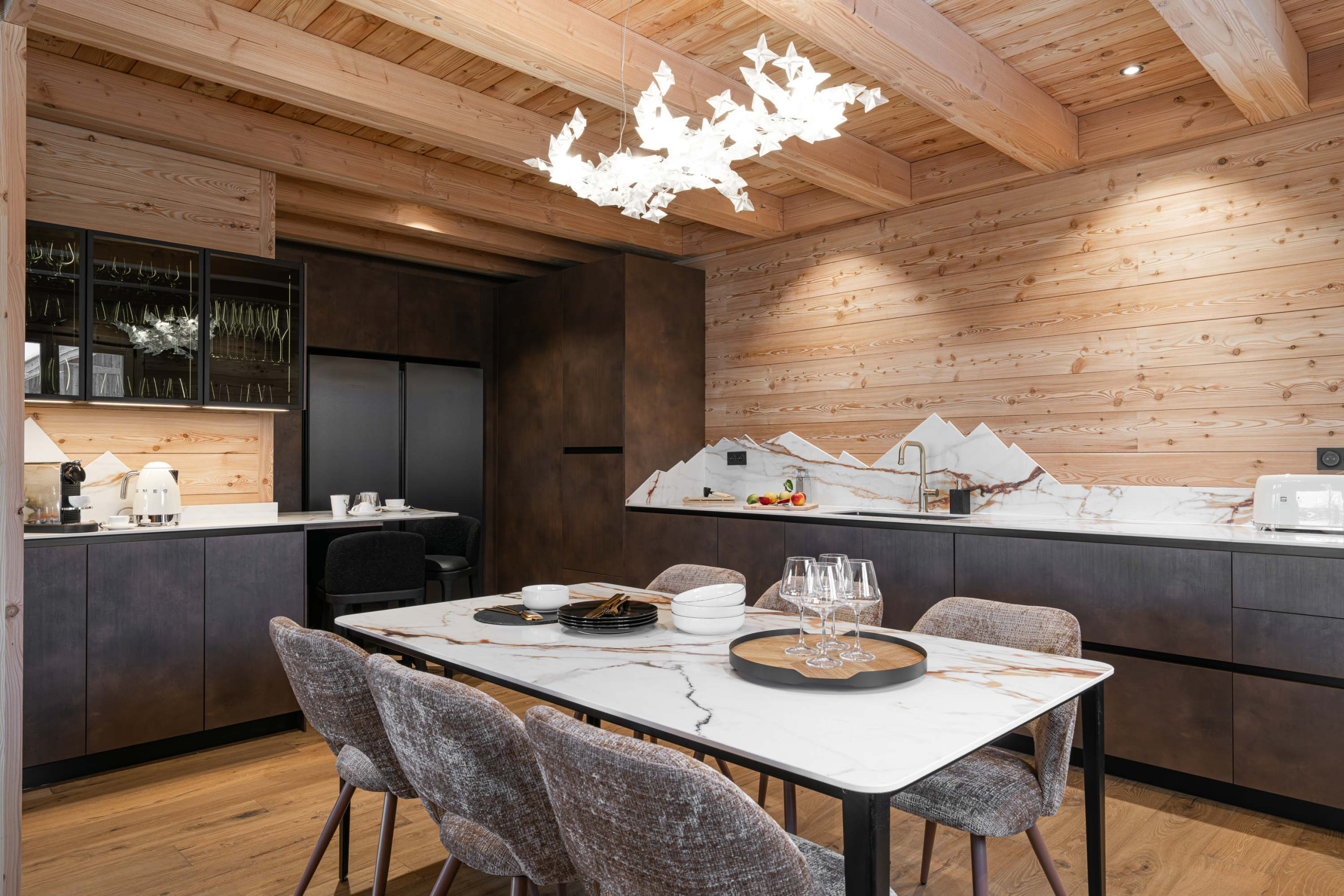 On the first floor, a vast living space bathed in natural light opens onto an exceptional panorama. The fully equipped American kitchen, the large family dining table and the cosy living room with Samsung Frame TV and fireplace invite conviviality after a day at altitude.