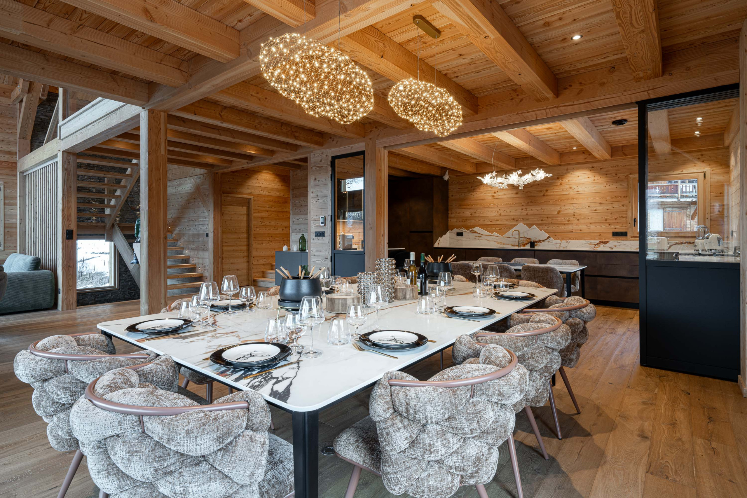 Au premier étage, une vaste pièce de vie baignée de lumière naturelle s’ouvre sur un panorama exceptionnel. La cuisine américaine entièrement équipée, la grande table à manger familiale et le salon cosy avec TV Samsung Frame et cheminée invitent à la convivialité après une journée en altitude.