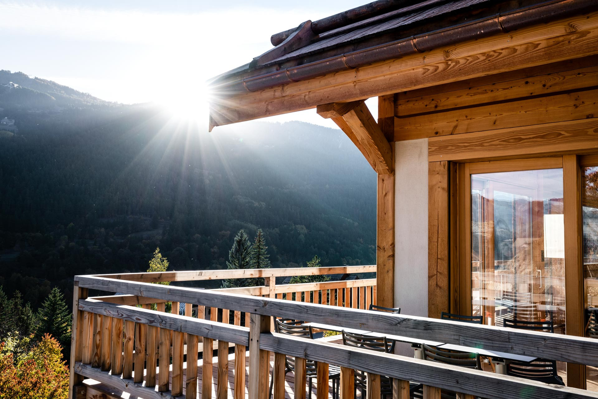 Une grande terrasse de 30m2 équipée de tables vient compléter l'espace de vie du chalet.