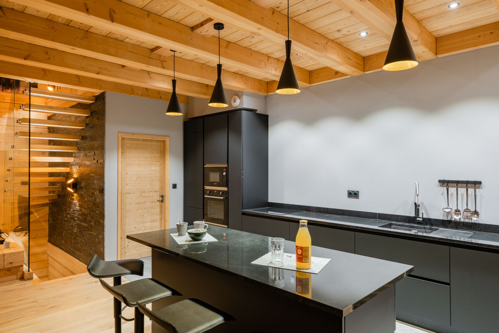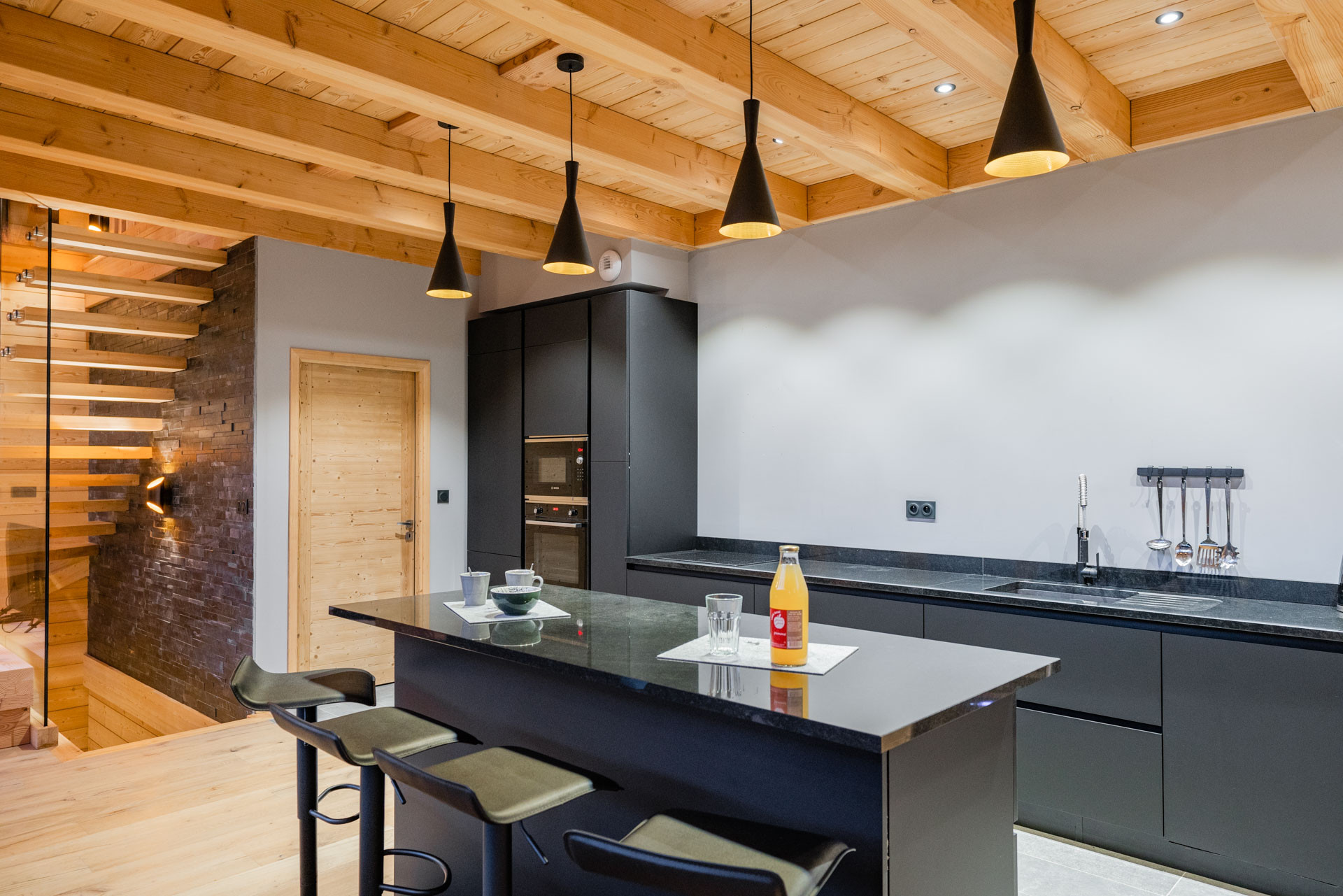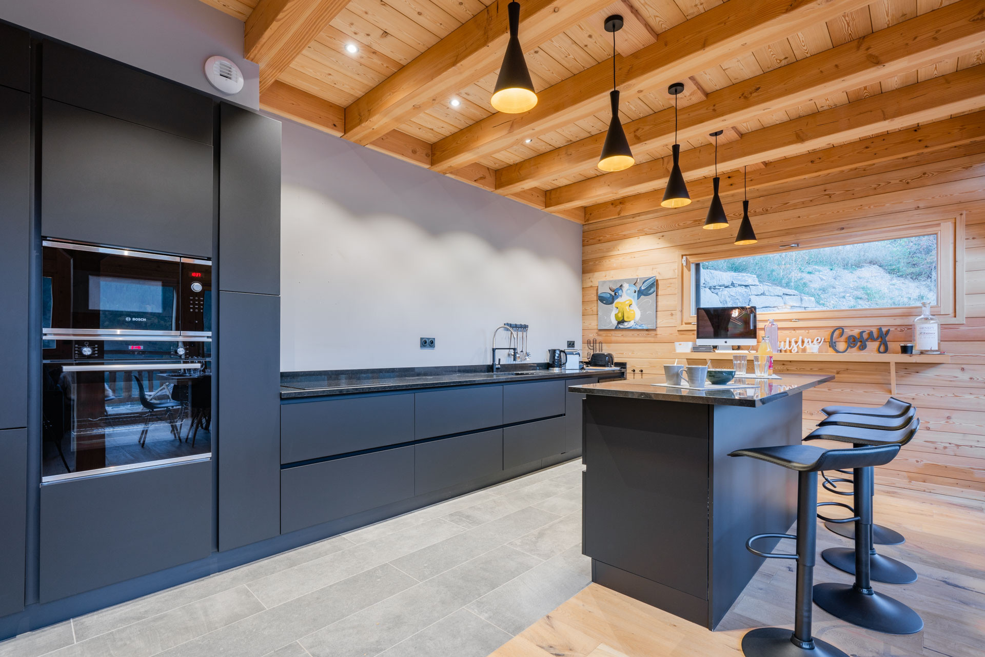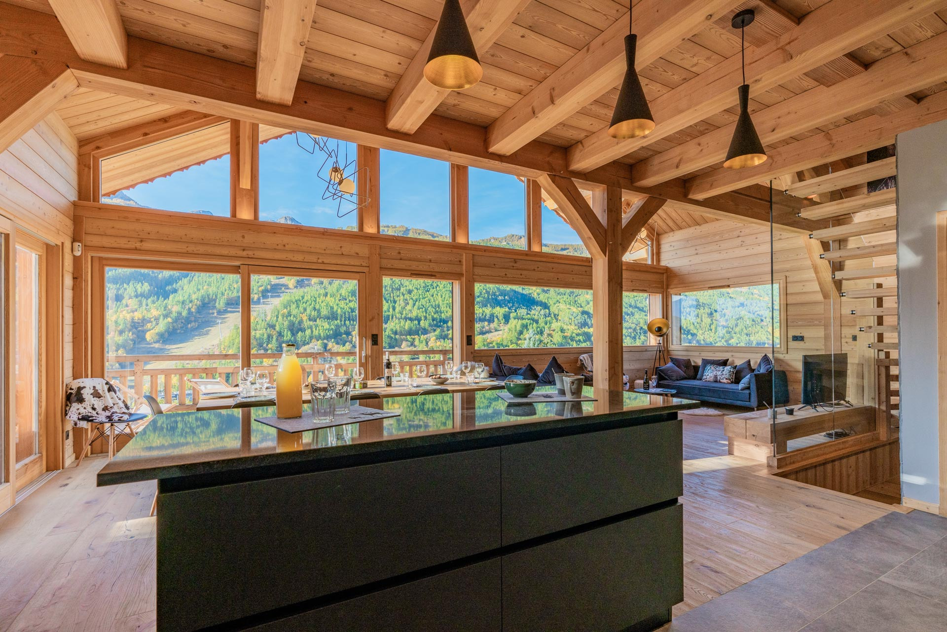 La cuisine américaine parfaitement équipée s’ouvre sur une vaste et lumineuse pièce à vivre avec ses larges baies vitrées, et permet d'accéder à la terrasse qui borde toute la longueur du chalet.